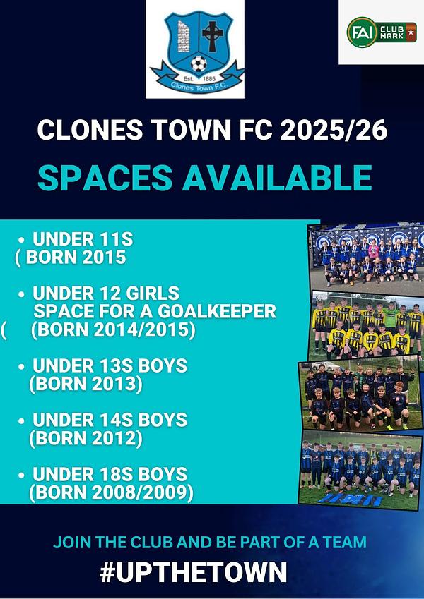 OR email your childs name and Date of Birth to secretary.clonestownfc@gmail.com.