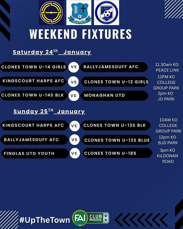 On Saturday, 2 of our Girls squads take to the field along with our Under 14s, then on Sunday both Under 13s teams are on the road while our Under 18s travel to take on Finglas Utd Youth in the FAI Youth Cup.